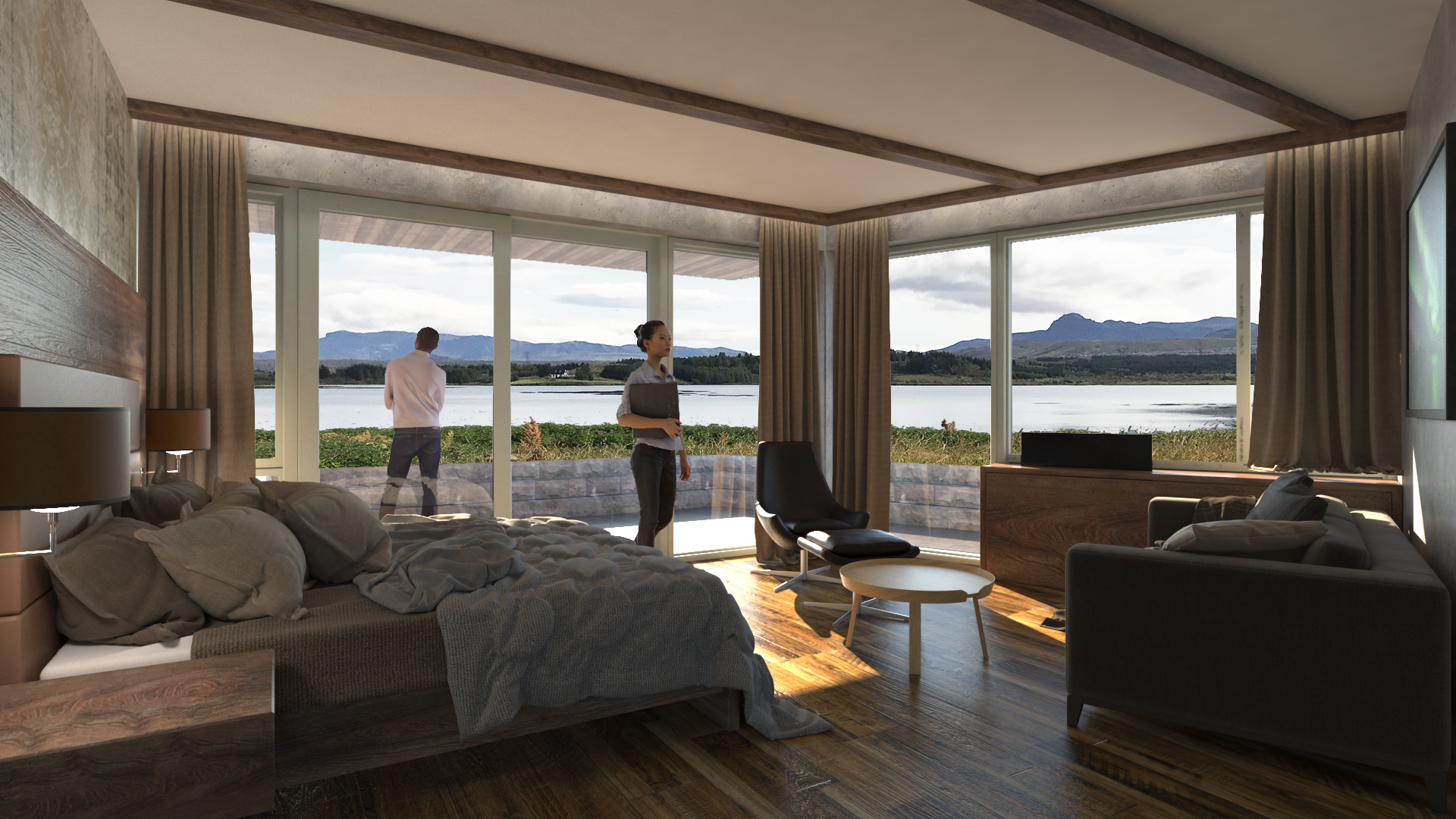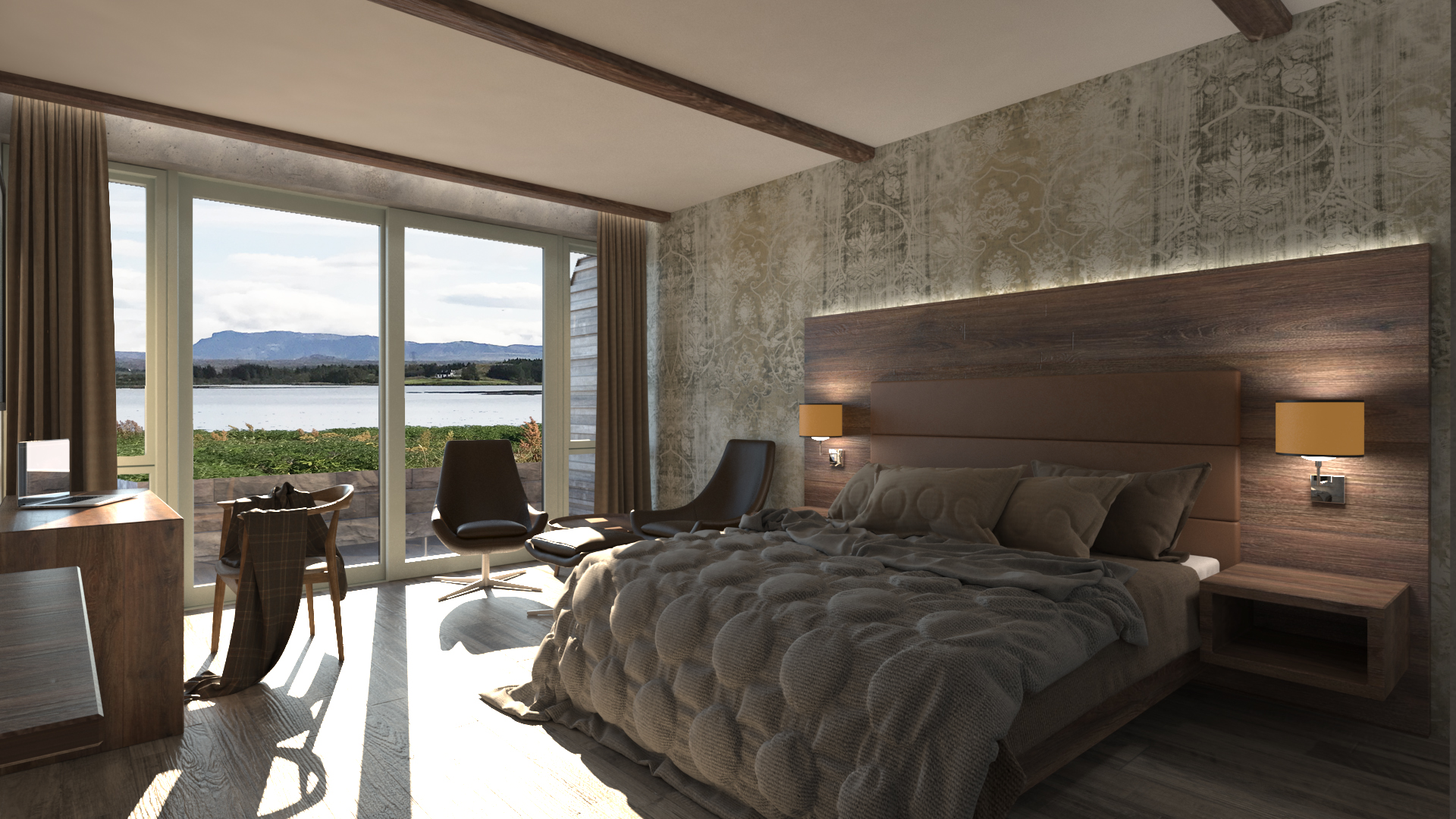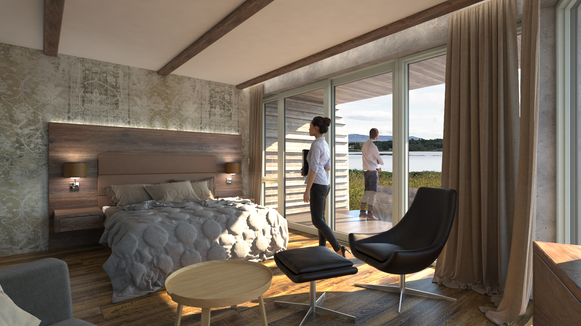 A 210 m² Restaurant & Banquet Hall, as well as 945m² Hotel Extension for 20 new suites, with alterations to 465m² of the older building including 6 new suites, new kitchen, and reception.  The new hotel suites are located at the lake, nestled into the ground at the lake.  The restaurant building on top, allowing great views to the Reykjavík mountain-range.