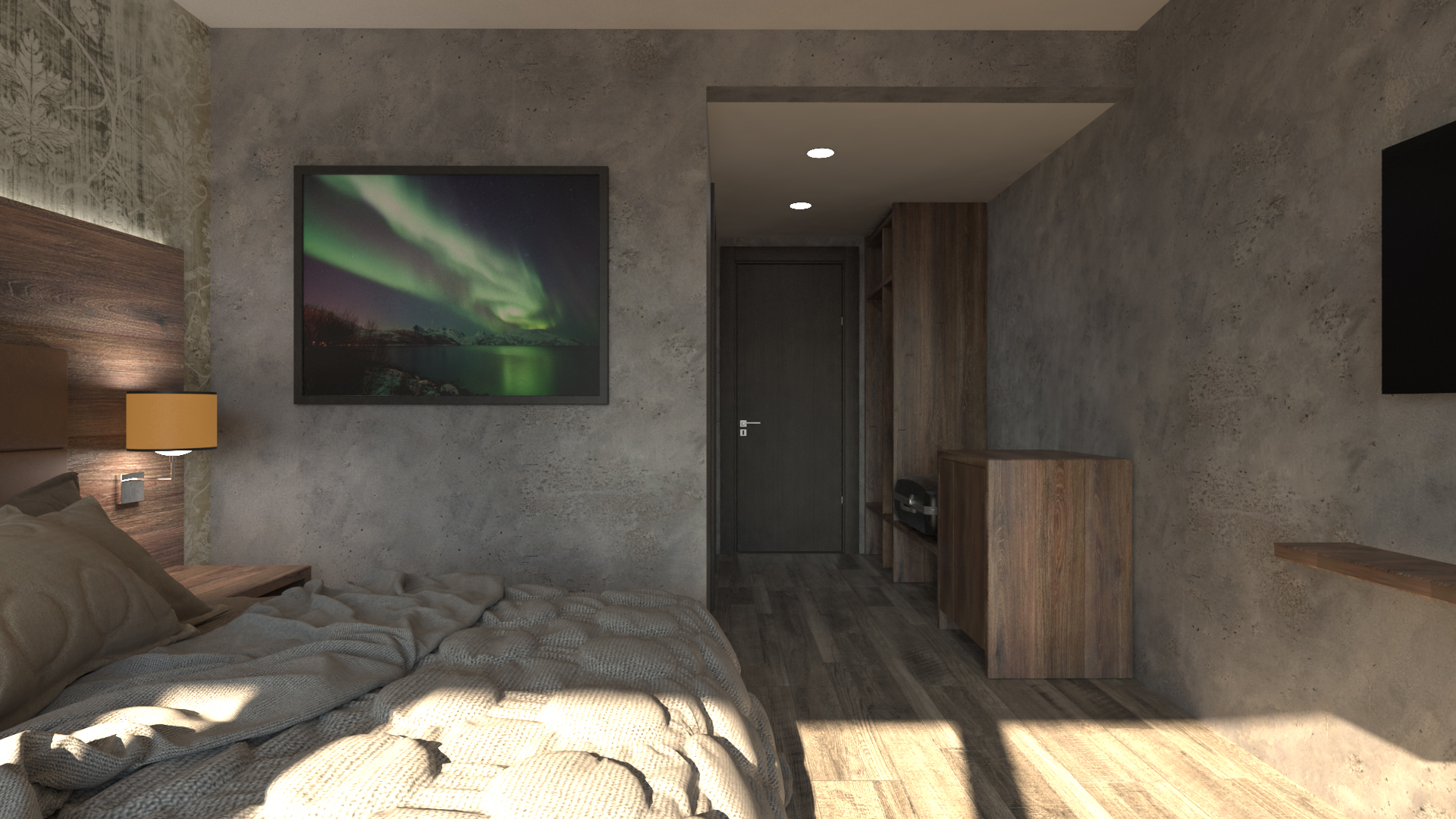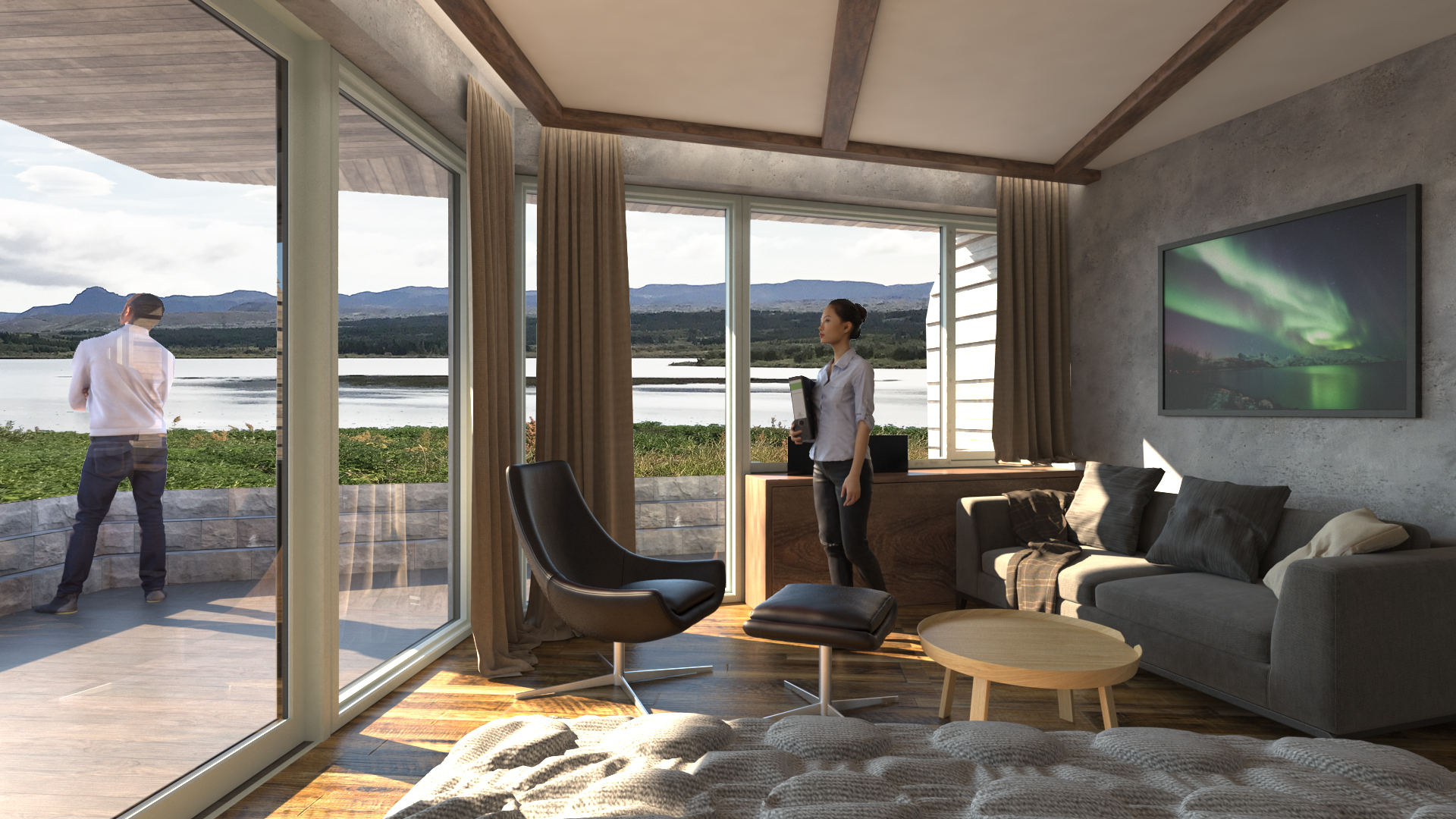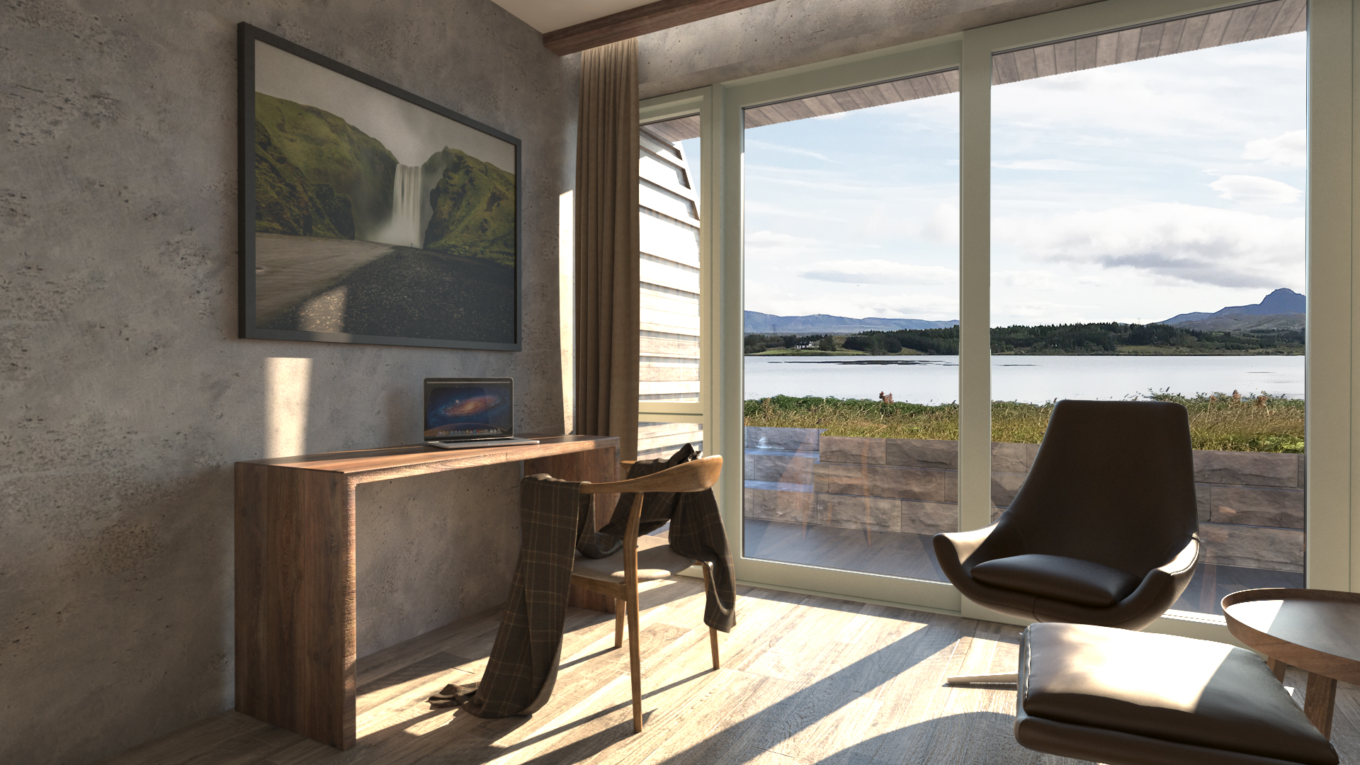 A 210 m² Restaurant & Banquet Hall, as well as 945m² Hotel Extension for 20 new suites, with alterations to 465m² of the older building including 6 new suites, new kitchen, and reception.  The new hotel suites are located at the lake, nestled into the ground at the lake.  The restaurant building on top, allowing great views to the Reykjavík mountain-range.